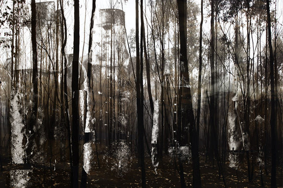 Aftermath is a haunting composition that fuses the ghostly outlines of the Kelly Gang’s armour with a charred Australian bushland, evoking both historical memory and environmental devastation. The iconic armour looms like spectres among the scorched trees, emerging from the shadows as enduring symbols of rebellion, violence and myth.
