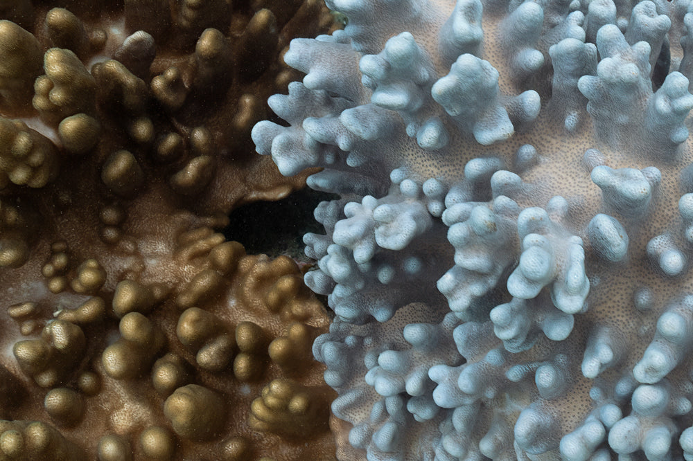 Duality explores the meeting point between two vastly different coral colonies ~ one rich and bronze, the other cool and blue ~ captured in exquisite detail beneath the surface of a tropical reef. Liam reveals the natural architecture of these living organisms, drawing attention to the way colour, texture and form shift dramatically across just a few centimetres.