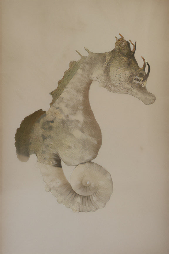 Texture replaces narrative. Subtle tonal shifts suggest erosion and accumulation, as if the figure has been uncovered rather than captured ~ an imprint rather than a moment. The seahorse reads as both body and artifact, hovering between the living and the elemental.
