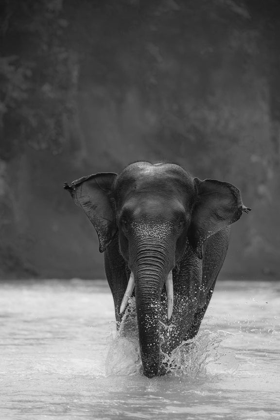 Tell Your Story Walking captures the commanding presence of a Sumatran Bull Elephant (Elephas maximus sumatranus) striding directly toward the camera through a shallow river. Photographed during a 2008 journey into the Sumatran rainforest with the Sumatran Ranger Project, this powerful image embodies both majesty and vulnerability — a rare encounter with one of the world’s most endangered giants.