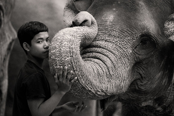 Photographed in Tangkahan, Sumatra, this portrait reveals the tender side of a species often defined by its size and strength. The elephant’s curled trunk rests gently against the boy’s shoulder, while his steady hand speaks to a connection built on patience rather than force. Their mirrored stillness tells a story of mutual understanding ~ a language without words.